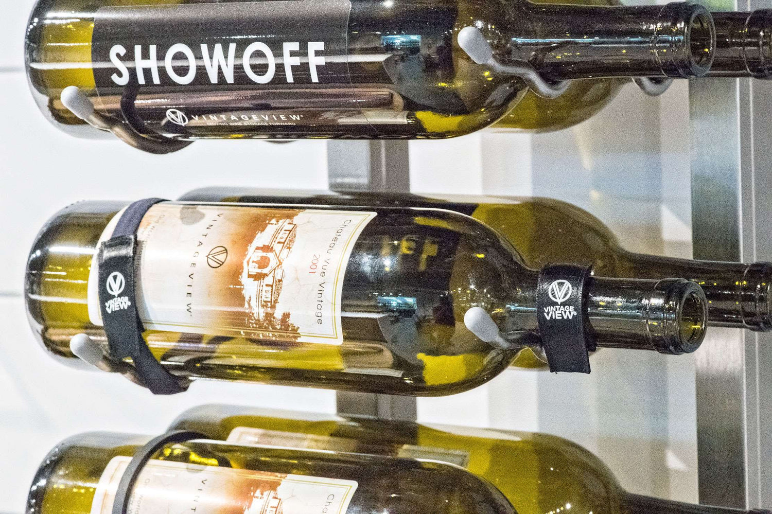 This will securely fasten bottles to any of VintageView’s label- or cork-forward wine racks to ensure they stay put in high traffic areas or regions affected by seismic activity.