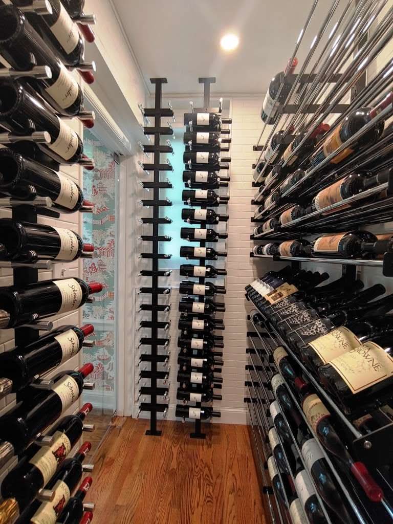 The Vino Series is our artistic, minimalist approach to bottle storage. Start with one bottle and let the interior designer in you run loose. Our label-forward Vino Pins and cork-first Rails are single-bottle metal wine racks that allow you to break from linear wine racking to invent artistic expressions that hold one bottle or thousands.