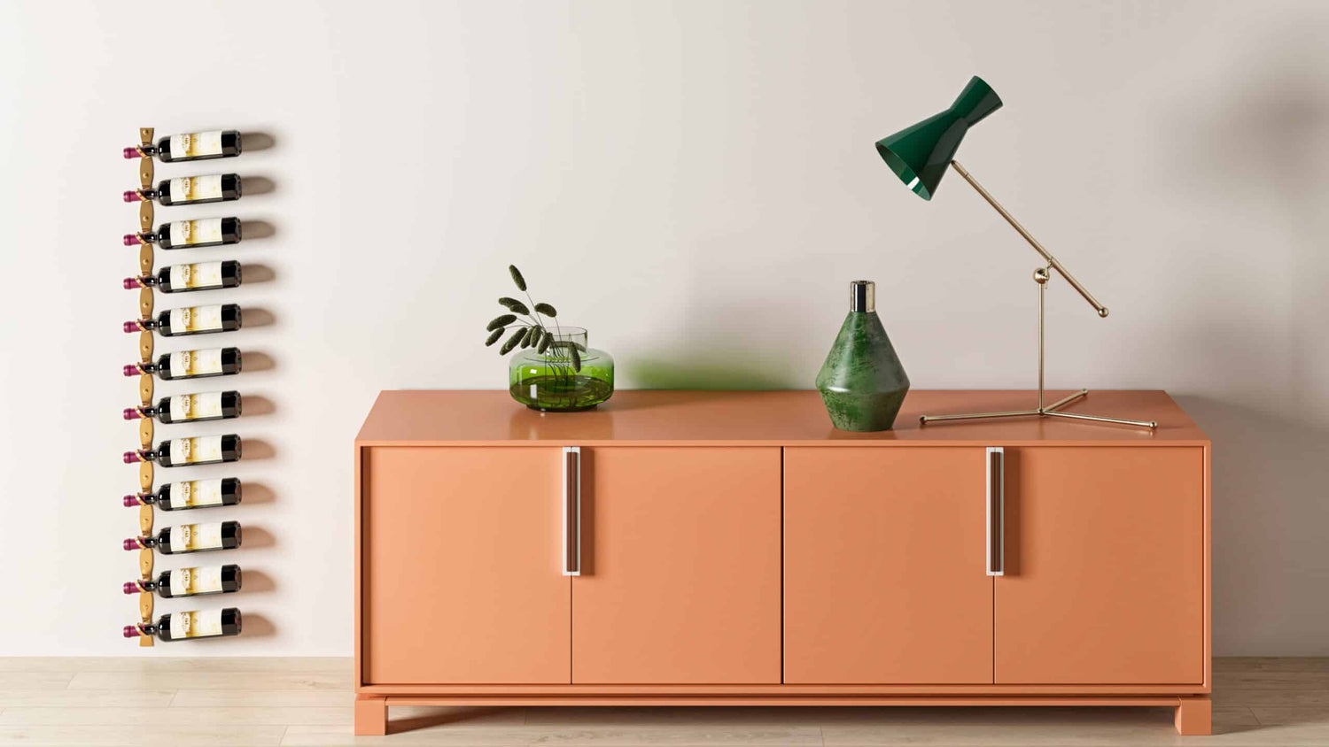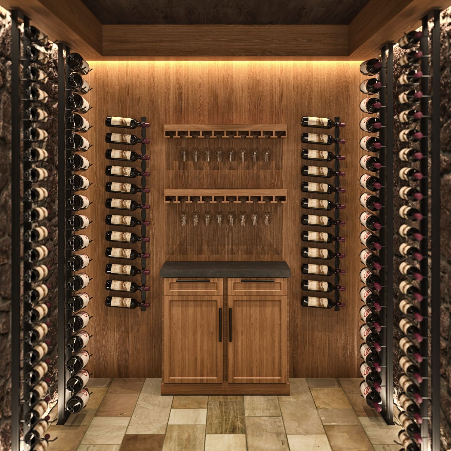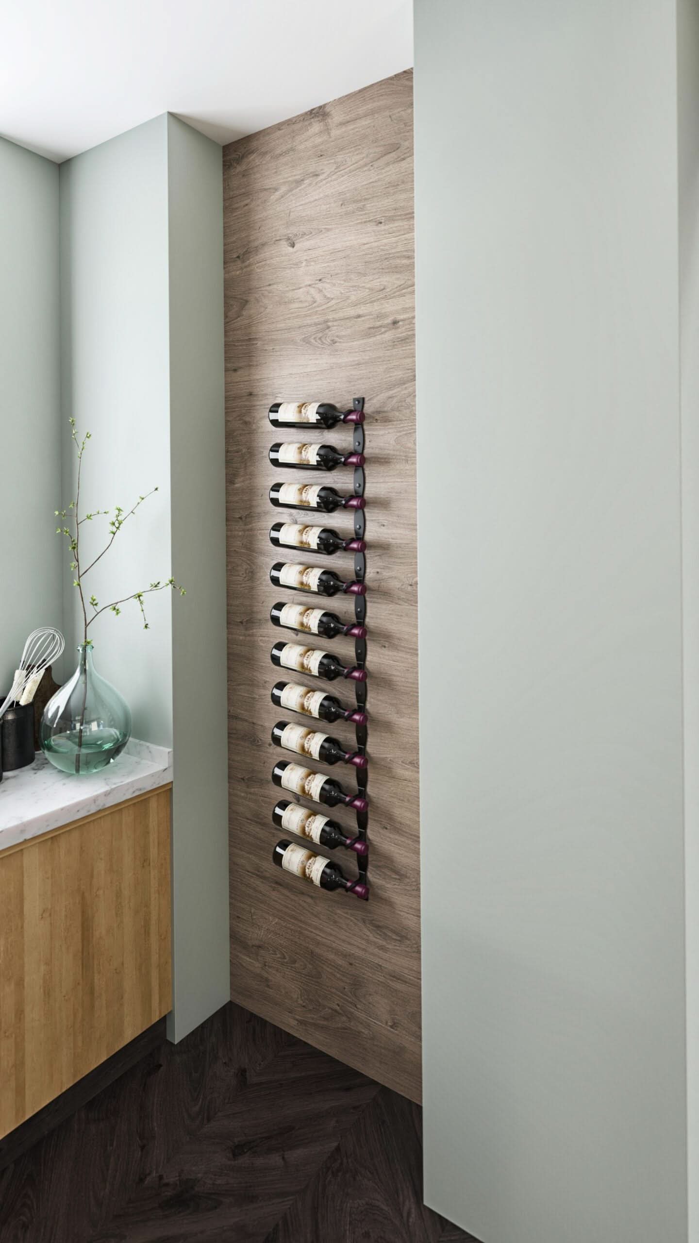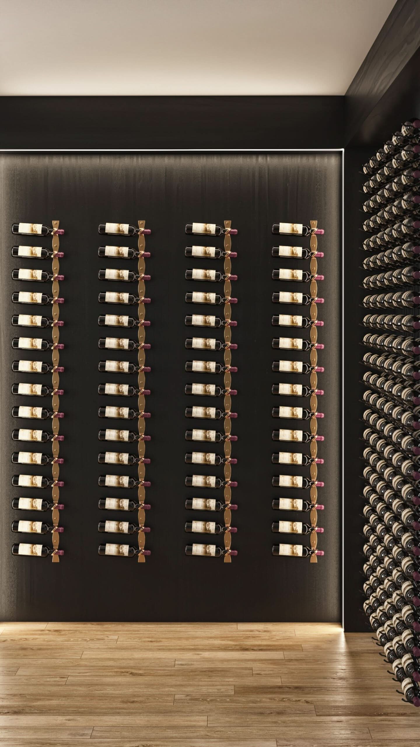Modernizing the classic riddling rack wine storage style, the R Series features elegant wine rack options that hold wine bottles by the neck to create the most minimalist wine storage available on the wall or floating from celling.